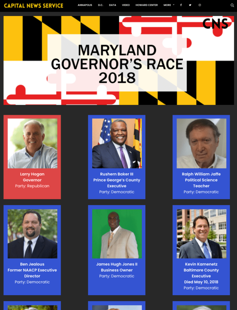 Description: I worked with a design partner to create this voter guide for the 2018 gubernatorial race in Maryland. We designed a total of 13 pages. Users can access each candidate’s profile when they click on a photo. We worked with another CNS reporter who gathered the information.